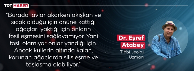 Burada lavlar akarken akışkan ve sıcak olduğu için önüne kattığı ağaçları yaktığından onların fosilleşmesini sağlayamıyor. Yani fosil olamıyor onlar yandığı için. Ancak küllerin altında kalan, korunan ağaçlarda silisleşme ve taşlaşma olabiliyor.”