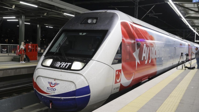 Cumhurbaşkanlığı İletişim Başkanlığı ile TCDD Taşımacılık AŞ Genel Müdürlüğünün iş birliğiyle 15 Temmuz Demokrasi ve Milli Birlik Günü temasıyla giydirilen ve bu yılki ilk seferi için Ankara'dan hareket eden yüksek hızlı tren (YHT), Kadıköy'deki YHT Garı'na ulaştı.