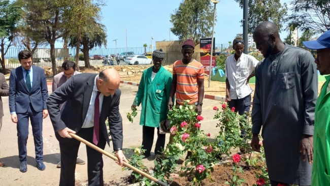 Büyükelçi Prof. Dr. Ahmet Kavas ve kısaca UCAD olarak ifade edilen üniversitenin rektörü Prof. Dr. Ahmadou Aly Mbaye, birlikte temsili olarak birer gül diktiler.