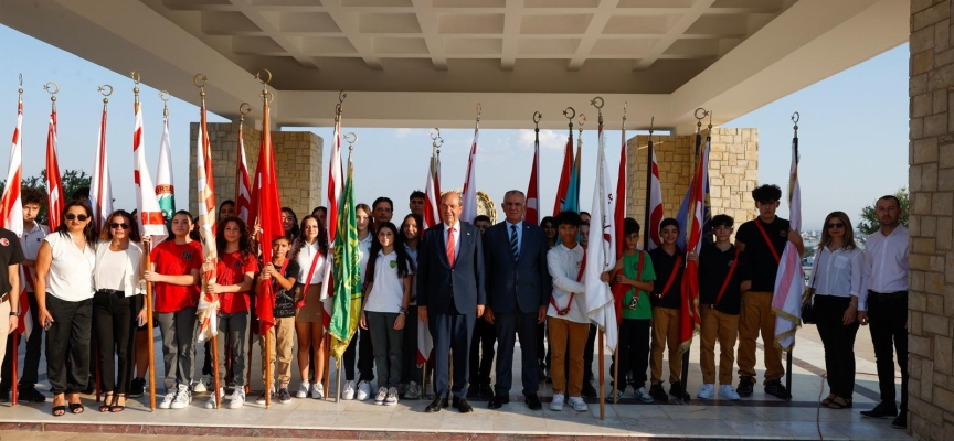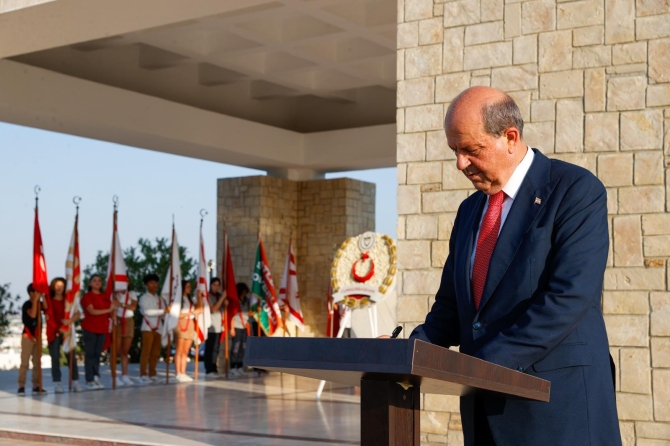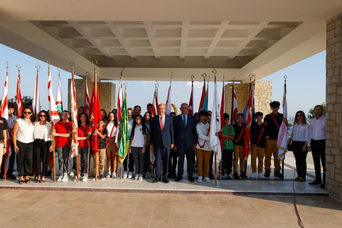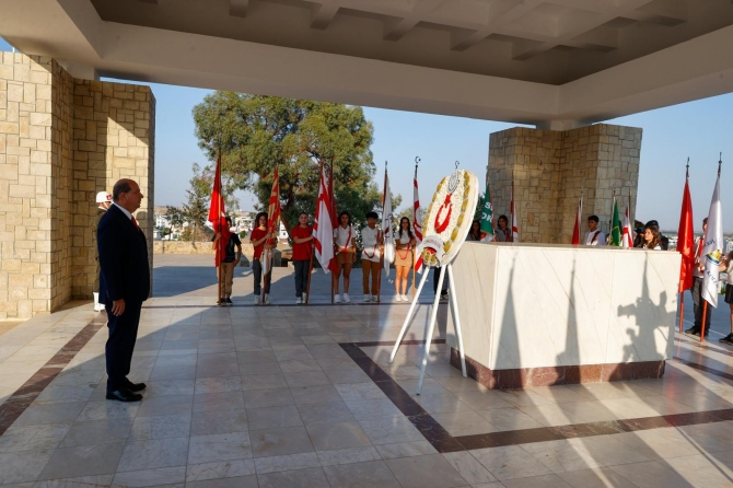 Cumhurbaşkanı Ersin Tatar tarafından anıta çelenk sunulmasıyla başlayan tören, saygı duruşu ve İstiklal Marşı eşliğinde bayrakların göndere çekilmesiyle devam etti.