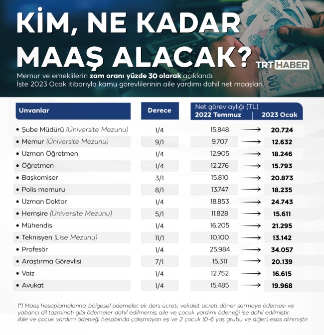 Ocak ayından geçerli olmak üzere kamu görevlileri ile memur emeklilerinin tamamının aylık ve ücretlerinde yüzde 8 oranında artış öngörüldü. 2022 yılı ikinci altı aylık döneminde enflasyon yüzde 15,40 olarak gerçekleşti. Gerçekleşen bu enflasyon oranından kaynaklı olarak ilave yüzde 8,48 artışla birlikte kamu görevlileri ile memur emeklilerinin aylık ve ücretlerinde Ocak 2023'ten geçerli olmak üzere toplamda yüzde 16,48, SSK ve Bağ-Kur emekli aylıklarında ise gerçekleşen enflasyona bağlı olarak yüzde 15,40 artış sağlanması planlanmıştı. Cumhurbaşkanı Erdoğan'ın açıklamasıyla bu oranlar yüzde 30 olarak uygulanacak.