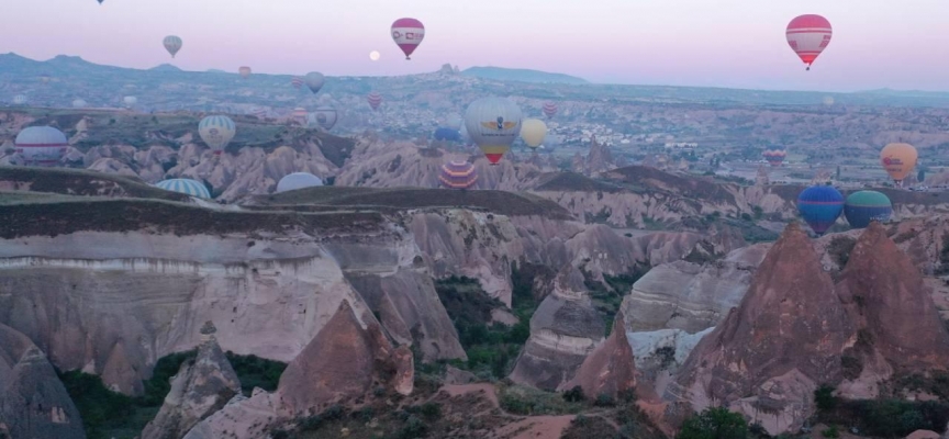 Göreme beldesi ve çevresindeki çeşitli alanlardan gün doğumunda gökyüzüne yükselen sıcak hava balonları, yaklaşık 45 dakika boyunca peribacalarıyla kaplı vadiler üzerinde süzülüyor.