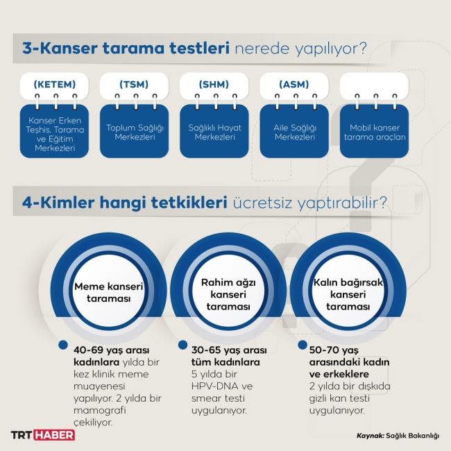 Türkiye’de 2008’den bu yana “Ulusal Kanser Kontrol Programı” yürütülüyor. Bu taramalar Kanser Erken Teşhis Tarama ve Eğitim Merkezleri (KETEM), Toplum Sağlığı Merkezleri (TSM), Sağlıklı Hayat Merkezleri (SHM), Aile Sağlığı Merkezleri (ASM) ve mobil kanser tarama araçlarıyla yapılıyor. Ücretsiz kanser taraması hakkında bilgi için https://hsgm.saglik.gov.tr/tr/ adresini ziyaret etmek yeterli.