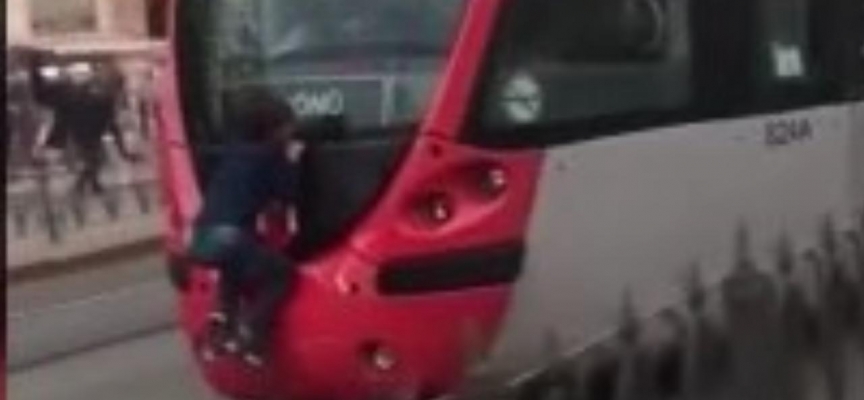 Bağcılar-Kabataş tramvay hattı Laleli mevkiinde önceki gün akşam saatlerinde 6 yaşında bir çocuğun tramvayın arkasına tutunarak yolculuk yaptığı görüldü.