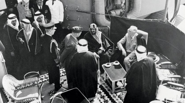 Amerikan Başkanı Franklin Delano Roosevelt, Suudi Arabistan Kralı Abdülaziz ile Süveyş Kanalı üzerinde bulunan Acı Göl’de demirlemiş ‘USS Quincy’ destroyerinde bir araya geldi.