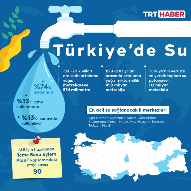 Türkiye’de sulardan sorumlu olan Tarım ve Orman Bakanlığı, bu yılı ’81 İle İçme Suyu Eylem Planı’ ile değerlendiriyor. Ocak ayında ‘Su Verimliliği Seferberliği’ başlatan bakanlığın planına göre tarım gibi su da ‘milli güvenlik meselesi’ olarak ele alınıyor ve “21. Yüzyılın en stratejik ve değerli kaynağı” olarak gösteriliyor. Bakanlık hesaplamalarına göre 2030 yılında 104 milyon, 2050 yılında 110 milyon nüfusa ulaşacak olan Türkiye ‘de, bugün itibariyle kişi başı kullanılabilir su miktarı yıllık bin 313 metreküp. Bu rakam Türkiye’yi ‘su stresi çeken ülke’ sınıfına sokuyor. Devlet Su İşleri Genel Müdürlüğü (DSİ) aracılığıyla, 1968’den bugüne 386 içme suyu projesi işletmeye alınmış ve yıllık 5 milyar metreküp içme suyu temin edilmişti. Bu yıl kuraklık yaşanması ve su ihtiyacının da artması nedeniyle, ’81 İle İçme Suyu Eylem Planı’ hazırlandı. Bu yılın teması ise ‘Ortaklıklar ve İş Birliği Yoluyla Değişimi Hızlandırmak’ olarak belirlendi.