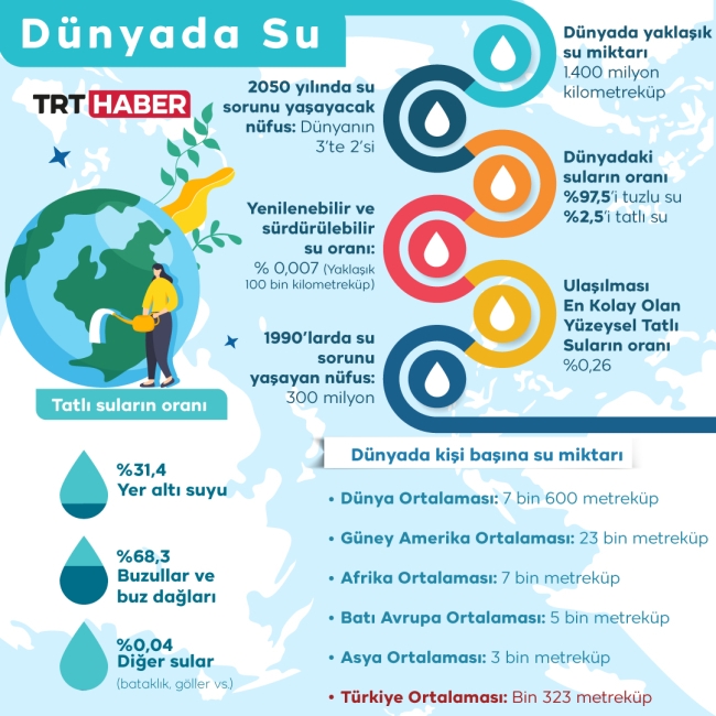 Dünyanın dörtte üçü sularla kaplı ancak bunun yüzde 2,5’u ancak içilebilir ve kullanılabilir su. Diğer bölüm ise tuzlu su olduğu için içmek ya da tarım için elverişli değil.