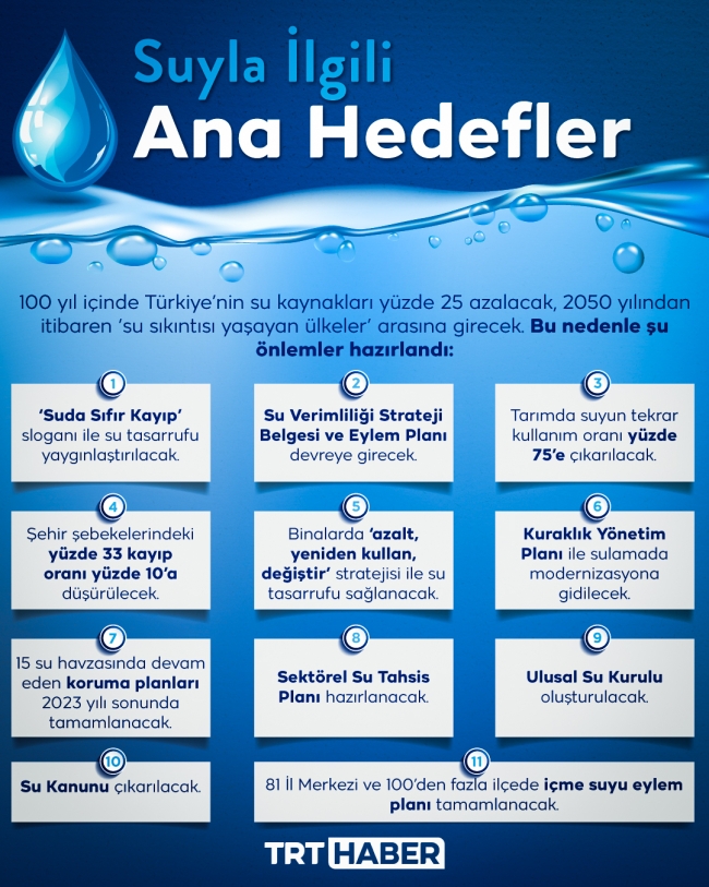Türkiye’nin 2050 yılından itibaren su sıkıntısı yaşayan ülkeler arasına gireceği tahmin ediliyor. 100 yıllık iklim değişikliği hesapları ise su kaynaklarının yüzde 25 azalacağını gösteriyor. Bu nedenle eldeki suyu daha verimli kullanmak için ‘Suda Sıfır Kayıp’ ilkesiyle tasarruf tedbirleri devreye sokulacak.
