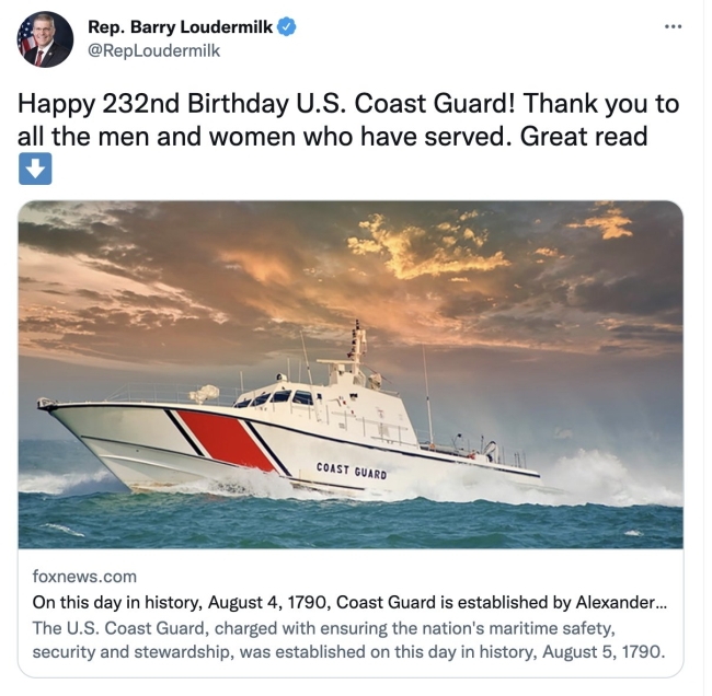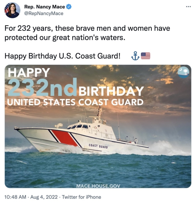 ABD Temsilciler Meclisi Üyesi Nancy Mace, ABD Sahil Güvenlik Komutanlığı'nın 232. yıl dönümüne özel sosyal medya hesabından paylaşım yaptı.