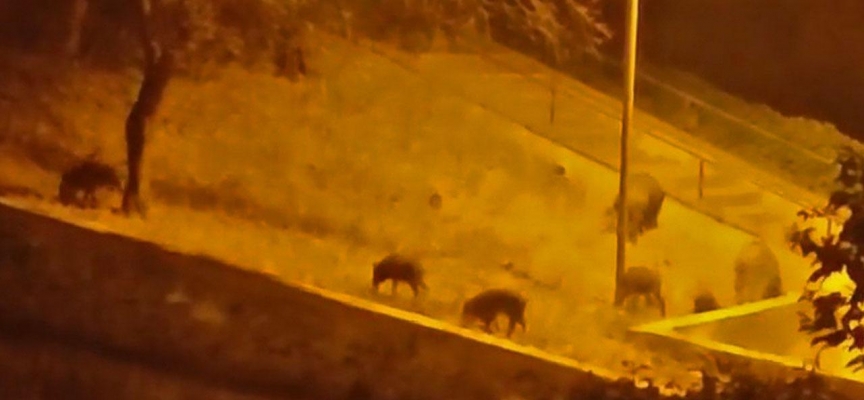 Bir süre çöp konteynırlarından yemek arayan domuz sürüsü, daha sonra geldikleri ormanlık alana giderek gözden kayboldu.
