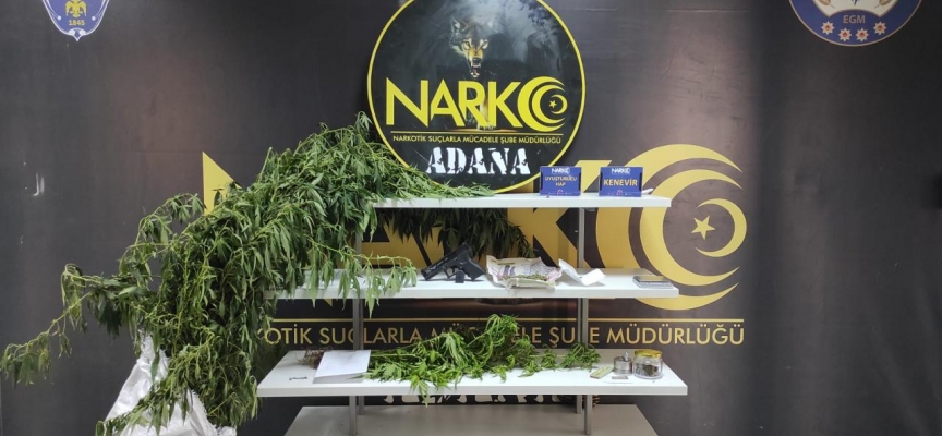 Bu kapsamda, merkez Seyhan ilçesi Yeşiloba Mahallesi'ndeki bir müstakil eve de baskın yapıldı. İkametin avlusunda toprağa ekili Hint kenevirleriyle karşılaşan ekipler, odalarda yaptıkları aramalarda da bir ruhsatsız tabanca buldu.