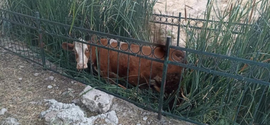 Ekipler, dere içerisinde bulunan demir korkulukları kesip ineği bulunduğu yerden kurtardı.
