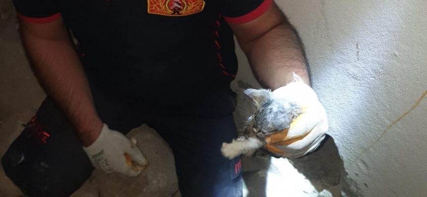Bölgeye gelen itfaiye ekipleri, merdivenle dere kenarına inerek yavru kediyi kurtardı.