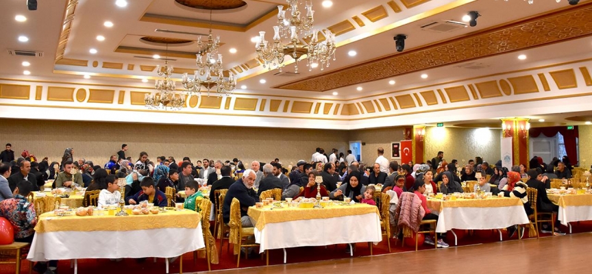 Aksaray Belediyesi'nce düğün salonunda düzenlenen iftar programında bir araya gelen depremzedeler, ezanın okunmasıyla oruç açtı.