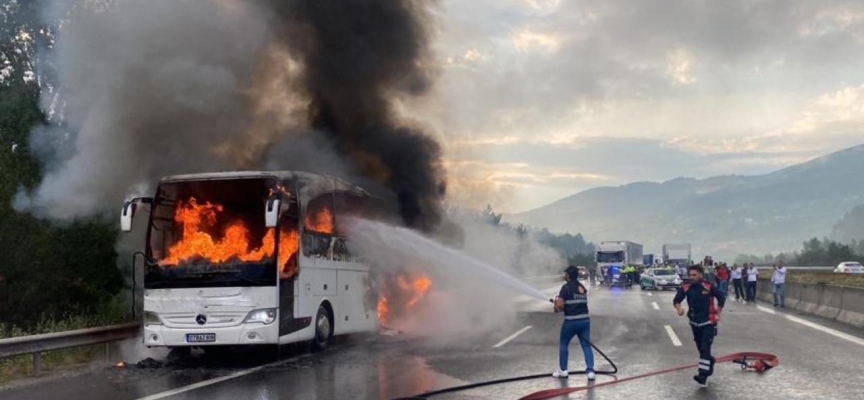 Trabzon'dan İstanbul istikametine giden yolcu otobüsünden duman kokusu geldiğini fark eden sürücü Barış Baca, Anadolu Otoyolu'nun Çaydurt yakınlarında aracı sağ şeride çekerek yolcuları tahliye etti.