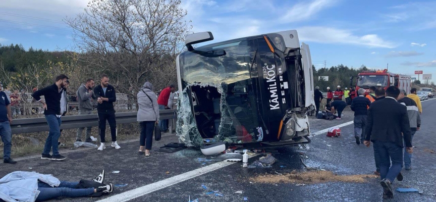 Otoyolun İstanbul istikametinde sürücüsünün kimliği henüz belirlenemeyen Kamil Koç firmasına ait yolcu otobüsü, Köroğlu Dinlenme Tesisleri yakınlarında yolun sağındaki bariyerleri kırarak devrildi.