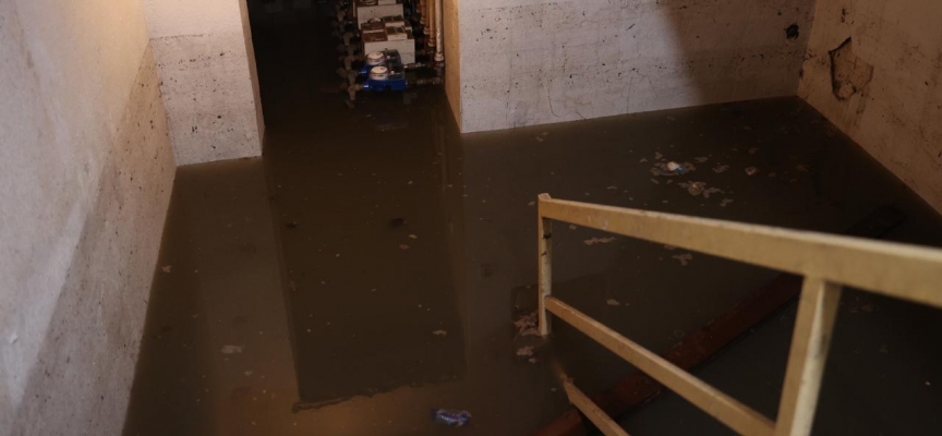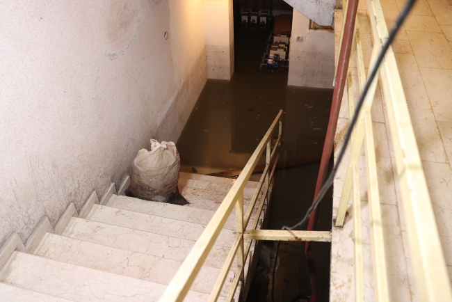 Bölgedeki Özdemir Apartmanı'nın alt katında bulunan depoda su seviyesi yarıya kadar yükselirken, bitişiğindeki apartmanın alt kattındaki dairede eşyalar kullanılamaz hale geldi.