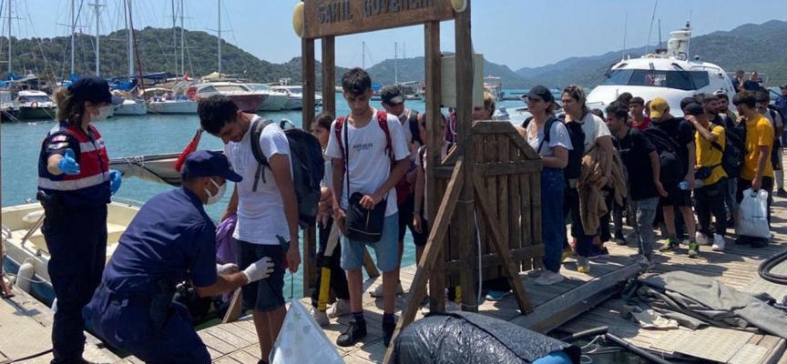 Düzensiz göçmenler, jandarma ekiplerince işlemleri yapılmak üzere teknelerle karaya çıkartılırken, göçmen kaçakçılığı yaptığı gerekçesiyle tekne mürettebatı hakkında adli işlem başlatıldı.