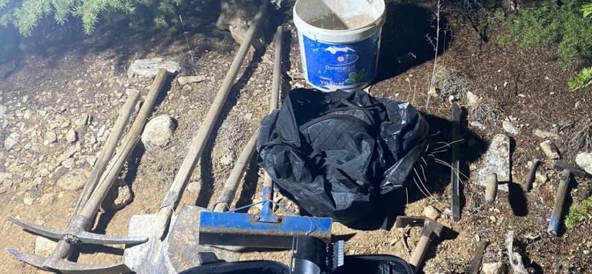 Gözaltına alınan şüphelilerin kazıda kullandıkları dedektör ile kazma ve kürek gibi malzemelere el konuldu.