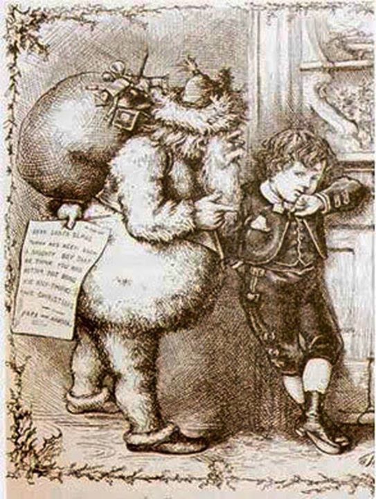 Thomas Nast, 1863'te ilk karikatür çizimlerini yapmış ve Noel Baba bu çizimlerde dini mesaj vermeyen, biraz daha seküler bir karakter olarak gösterilmişti.