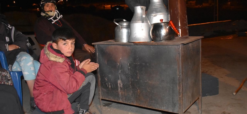 Evlerine girmekten korkan bazı vatandaşlar, soğuk hava nedeniyle dışarıda kurdukları sobanın başında oturuyor.