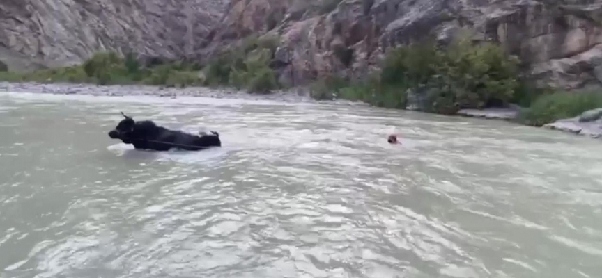 Artvinli boğa yetiştiricisi Abdullah Sami Özalp, boğasıyla Çoruh Nehri'nde yüzdü.