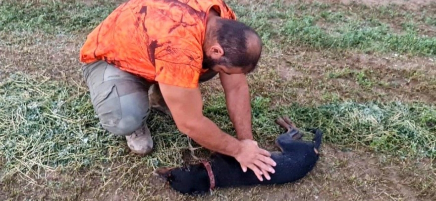 Bu esnada aracın kasa kısmında bulunan av köpeği, aşağıya atlamaya çalıştığı sırada tasmasının ipi boyuna takılarak asılı kaldı. Bir süre sonra avcılar köpeğin asılı ve hareketsiz durduğunu fark etti.