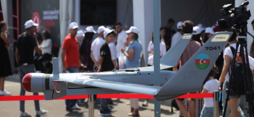 Azerbaycan'ın yerli kamikaze SİHA'sı "İti Kovan" önünde vatandaşlar hatıra fotoğrafları çektirdi.