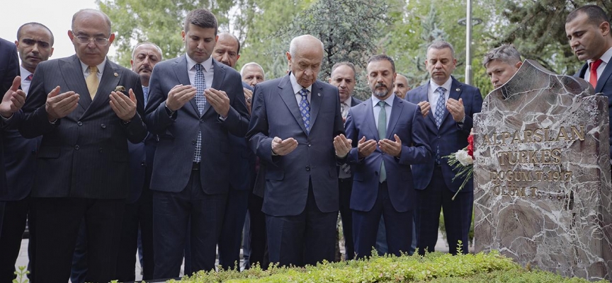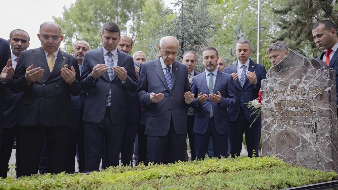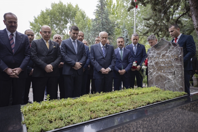 MHP Genel Başkanı Bahçeli, Kur'an-ı Kerim tilavetinin ardından Türkeş'in kabrine karanfil bıraktı, bakır ibrikle su döktü.