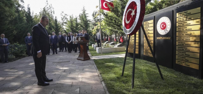 Saygı duruşuyla başlayan törende konuşan Çavuşoğlu, "1973'ten bu yana terör örgütlerinin temsilciliklerimizi hedef alan saldırılarında diplomatlarımız ile aile mensuplarından 41 şehit verdik. Her sabah Bakanlığımızın girişinde aziz şehitlerimizin altın harflerle yazılı isimlerini görerek mesaimize başlıyoruz. Şehitlerimizin hatıralarını başta şehadet şerbetini içtikleri ülkelerde yaptırdığımız anıt ve plaketlerle her yıl düzenlediğimiz anma törenleriyle yaşatıyoruz." dedi.