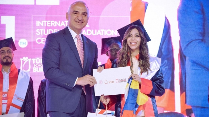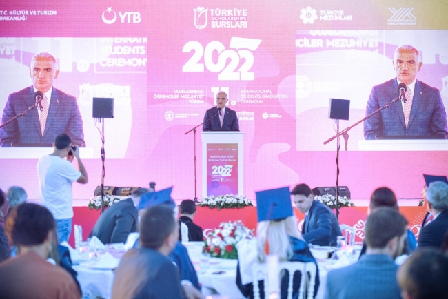 Bakan Ersoy, "2021-2022 döneminde mezun olmaya hak kazanan öğrenci sayımız 2 bin 325'e ulaştı. Mezuniyet törenimizde bugün lisans, yüksek lisans ve doktora düzeyinde başarı basamaklarında üst sıralarda yer alan ve 74 farklı ülkeden 300 öğrencimizi ağırlıyoruz." dedi.