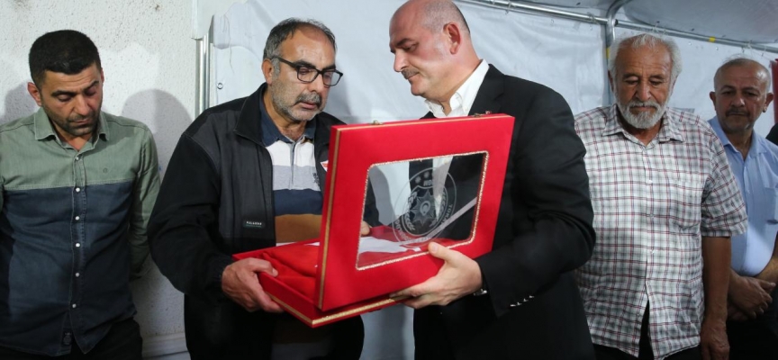 Şehidin annesi Perihan Tekin'in evinin önüne gelerek baba Mehmet Çalışgan ve aile bireylerine başsağlığı dileyen Soylu, şehidin tabutuna örtülen Türk bayrağı ile fotoğrafını babasına teslim etti.