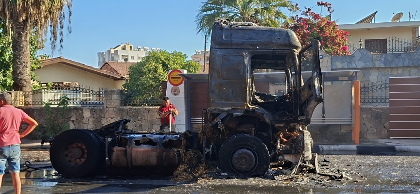 “03.07.2025 tarihinde, saat 17.00 sıralarında, Mustafa Kemal Bulvarı üzerinde Sema Otel önlerinde, seyir halinde bulunan ve arkasında balya yüklü tır araçta henüz tespit edilemeyen sebepten dolayı yangın meydana geldi. Yangına polis itfaiye ekipleri ile Gazimağusa Belediyesi ve özel şirketlere ait su tankerleri ile müdahale edildi. Yangın sonucu bahse konu tır araç ve arkasında yüklü bulunan balyalar yandı. Alevlerin tır aracın yakınında park halinde bulunan UY 261 plakalı araca sirayet etmesi sonucu da konu araç kısmen yanarak maddi hasar meydana geldi. Soğutma çalışmaları devam ediyor.”