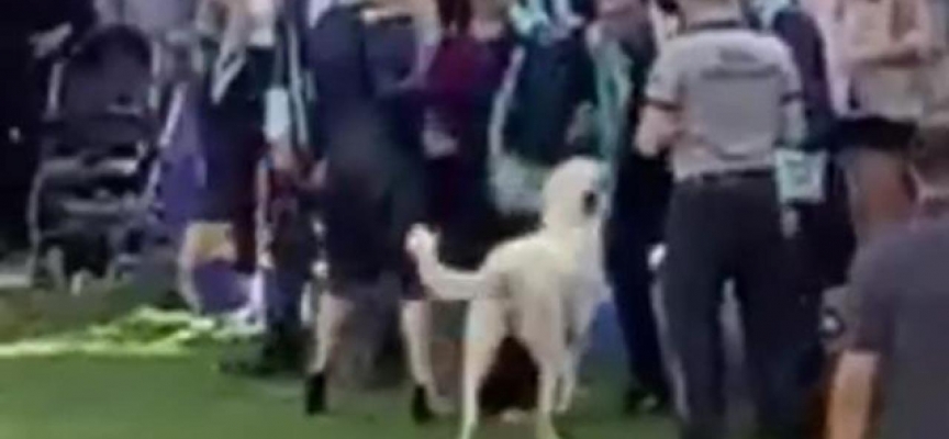 İnsanlar korkuyla kaçışırken köpek, alanda bulunan görevlilerce uzaklaştırılmaya çalışıldı.