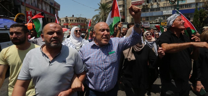 Gazze halkıyla dayanışma içerisinde olduklarını ifade eden Filistinliler, İsrail'i kınayan pankartlar taşıyarak sloganlar attı.