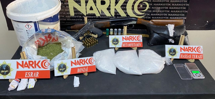 Adreslerde yapılan aramalarda, 4 kilo 406 gram metamfetamin, 436 gram esrar, 6,75 gram sentetik kannobinoid, 0,84 gram eroin, 2 sentetik ecza, ruhsatsız tabanca, 25 fişek, ruhsatsız av tüfeği, 5 kartuş, hassas terazi ve elek ele geçirildi.