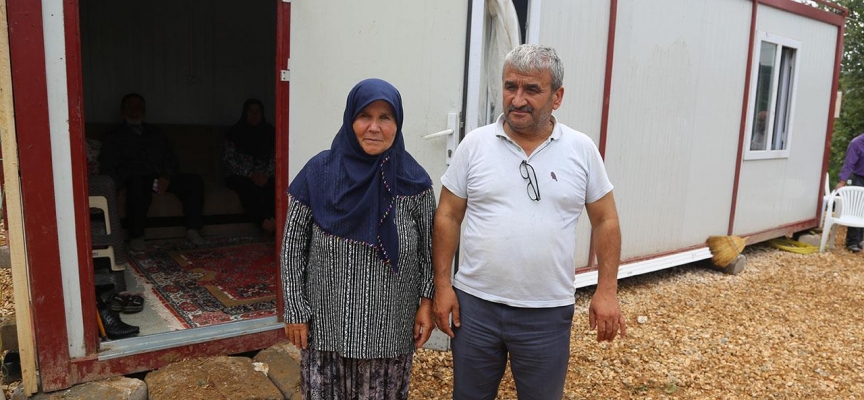 Acil kullanılacak eşyaların iş makinesi yardımıyla evden çıkarılmasının ardından yeni prefabrik konutlarına geçen çift, Turan ve komşuları ile emeği geçenlere teşekkür etti.