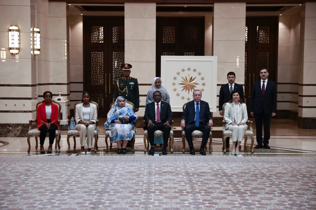Büyükelçi Eltayeb'in eşi, çocukları ve bazı büyükelçilik mensuplarını Cumhurbaşkanı Erdoğan'a takdiminin ardından hatıra fotoğrafı çektirildi.