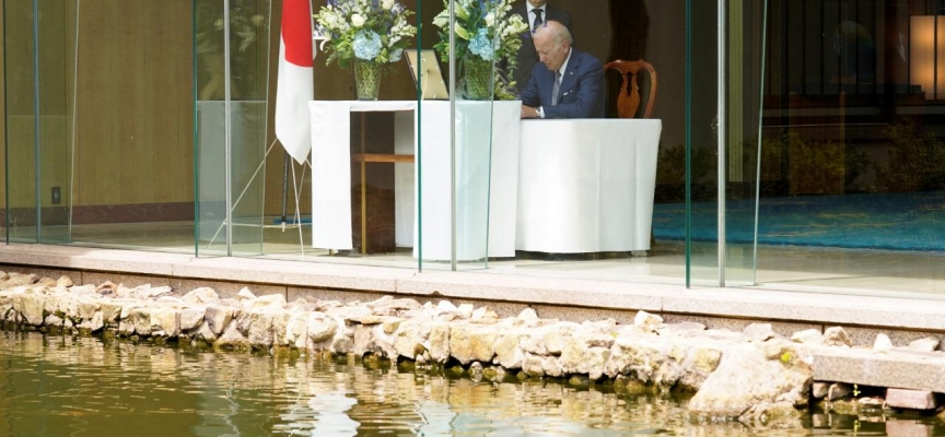 Burada Abe için açılan taziye defterini imzalayan Biden, Japonya'nın ABD Büyükelçisi Koji Tomita'ya taziyelerini sundu.