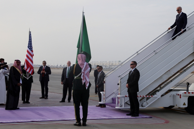 Biden'ı taşıyan başkanlık uçağı Suudi Arabistan'ın Cidde kentindeki Kral Abdulaziz Uluslararası Havalimanı'na indi.