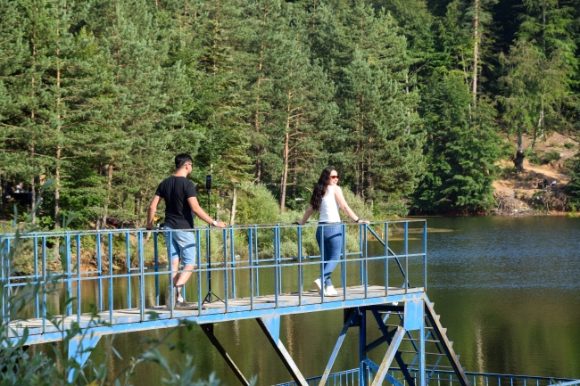Göletin doğasına ve yansımalarına hayran kaldıklarını belirten Gürcan, "Sünnet düğünümüz vardı, fotoğraf çekinmek için civarlarda en güzel yerin Bozcaarmut olduğunu düşündük ve buraya fotoğraf çekimine geldik" diye konuştu.