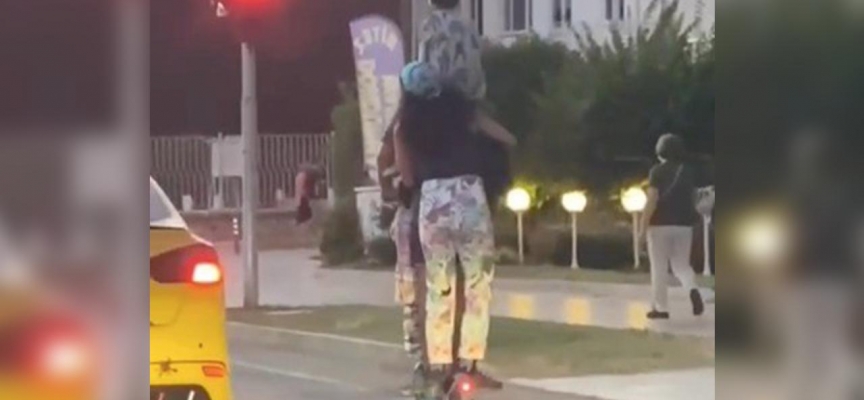 Diğer taraftan cep telefonu kamerasına yansıyan görüntüler adeta pes dedirtti. Görüntülerde, bir scootera 3 kişinin bindiği, bununla da kalmayarak kişinin omzuna bir çocuğun da oturduğu görüldü. Sosyal medyada paylaşılan görüntüler büyük tepki çekti.