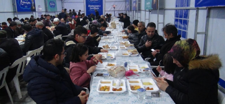 Ramazan dolayısıyla ilçe merkezinde kurulan çadıra gelen vatandaşlar, görevlilerin dağıttığı yemeklerden alarak ezanın okunmasıyla oruçlarını açıyor.