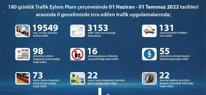 Açıklamada, “Bitlis Emniyet Müdürlüğü Trafik Tescil ve Bölge Trafik Denetleme Şube Müdürlüğümüze bağlı ekiplerimizce, 180 günlük Trafik Eylem Planı çerçevesinde 1 Haziran - 1 Temmuz 2022 tarihleri arasında il genelinde icra edilen trafik uygulamalarında, 19 bin 549 araç ve sürücüsü kontrol edilmiş, 3 bin 153 adet trafik idari ceza tutanağı düzenlenmiş, 131 adet araç/motosiklet trafikten men edilmiştir.