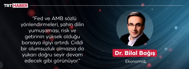 “Dışarıda da Fed ve Avrupa Merkez Bankası (AMB) sözlü yönlendirmeleri, şahin dilin yumuşaması, risk ve getirinin yüksek olduğu borsaya ilgiyi artırdı. Ciddi bir olumsuzluk olmazsa da yukarı doğru seyir devam edecek gibi görünüyor”.