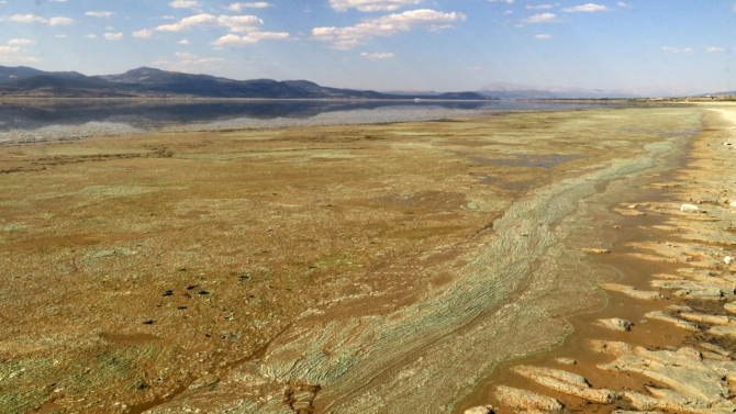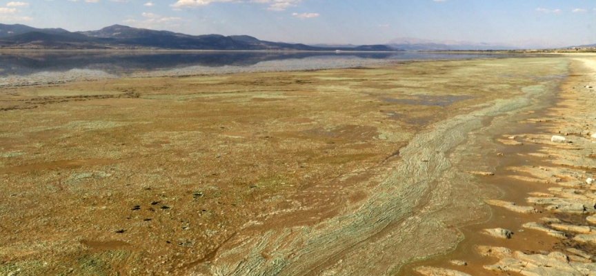 Son yıllarda suyu hızla çekilen ve kuruma tehlikesiyle karşı karşıya olan Burdur Gölü'ndeki alg patlaması nedeniyle suyun rengi değişti.