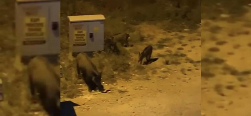 Mudanya ilçesi Yeni Mahalle'de, aç kalan domuz sürüsü yemek aramak için şehir merkezine indi.
