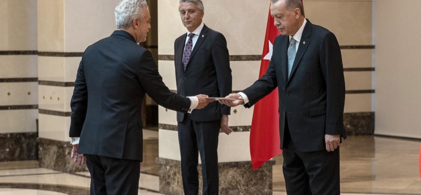 Cumhurbaşkanlığı Külliyesi'ndeki kabulde, Büyükelçi Korukoğlu, Erdoğan'a güven mektubu sundu.