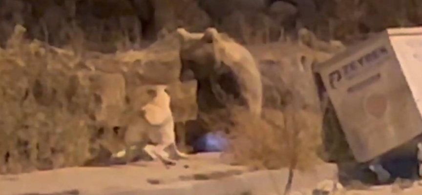Sarıkamış’ta karnını doyurmak için caddeye inen bozayı köpeklere ve vatandaşlara aldırış etmeden gözüne kestirdiği çöp konteynırının önüne geldi.