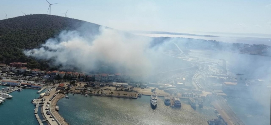 Çeşme Marina yakınlarındaki makilik alanda henüz belirlenemeyen nedenle yangın çıktı.